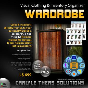 Have you ever found an item in SL that can be described as simply fabulous, and something that you just can’t do without. This is how i feel about Carlye Thea Solutions Wardrobe. It helps to take an inventory nightmare into an organised pleasure.